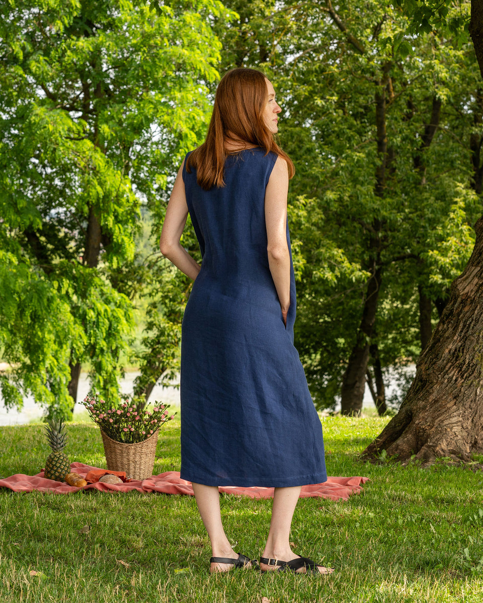 Faith Sommerkleid mit einer vorn zu öffnenden Tunika aus 100 % Bio-Leinen. Das Leinen-Sommerkleid für Damen sorgt für ein leichtes und luftiges Tragegefühl. Das Damenkleid ist mit Muschelknöpfen vorne, zwei Seitentaschen und einem entspannten Schnitt ausgestattet, der für jede Figur geeignet ist.