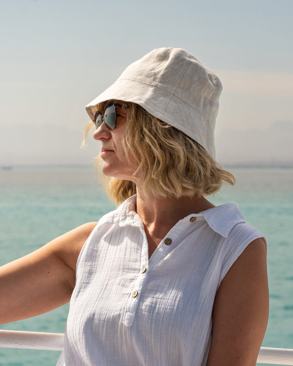 Nachhaltiger und biologischer Leinen-Bucket-Hut, entworfen mit Ihrem Komfort im Blick. Hergestellt aus hochwertigem, atmungsaktivem Leinen, ist er ein idealer Sommerhut für Frauen. Keine Reizungen, kein Schwitzen – einfach ein angenehm zu tragender Stil. Verleihen Sie Ihrem Look mit einem Hut, der sich genauso gut anfühlt, wie er aussieht, das gewisse Etwas. Kombinieren Sie ihn mit einem luftigen Leinen-Sommerkleid oder Ihrem Lieblingsbadeanzug für einen trendigen Küsten-Look.