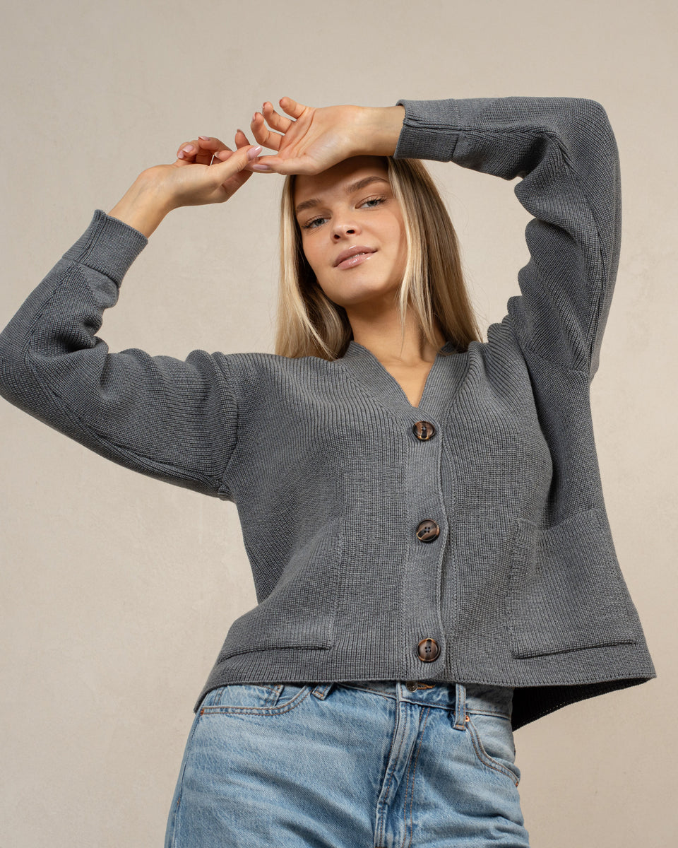 Diese vielseitige Merinowoll-Strickjacke für Damen verfügt über einen Knopfverschluss, eine kastige Passform und praktische Taschen für Stil und Funktionalität. Hergestellt aus hochwertiger 100% Wolle, reguliert sie auf natürliche Weise die Temperatur und sorgt das ganze Jahr über für Komfort. Mit gerippten Bündchen und einem dreieckigen Detail an den Ärmeln ist sie perfekt zum Schichten oder zum lockeren Tragen geeignet. Außerdem können Sie sich in der Mini-Me-Version mit Ihrem Kleinen passend kleiden.