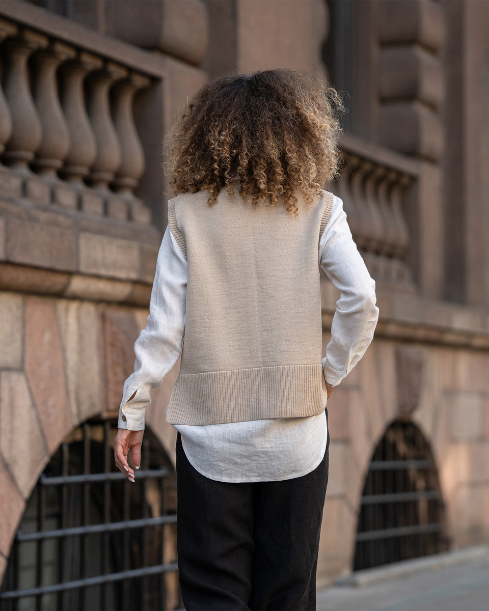 Eine 100% Merinowoll-Strickweste bietet raffinierten Komfort und verbindet außergewöhnliche Weichheit mit einem schön eleganten Look. Der gerippte Halsausschnitt und Saum verleihen subtile Raffinesse, während der klassische V-Ausschnitt, die etwas kürzere Vorderseite und der verlängerte Rücken eine anmutige und schmeichelhafte Silhouette schaffen. Perfekt als Einzelstück oder über einem knusprigen Hemd getragen, wechselt die gestrickte Sweaterweste mühelos von entspannten zu eleganten Anlässen. Premium-Merinofasern regulieren auf natürliche Weise die Temperatur, sorgen an kühleren Tagen für wohlige Wärme und bieten drinnen ein frisches, atmungsaktives Tragegefühl. Ein zeitloses, luxuriöses Garderoben-Basic, entworfen für alle, die außergewöhnliche Qualität und moderne Eleganz schätzen.