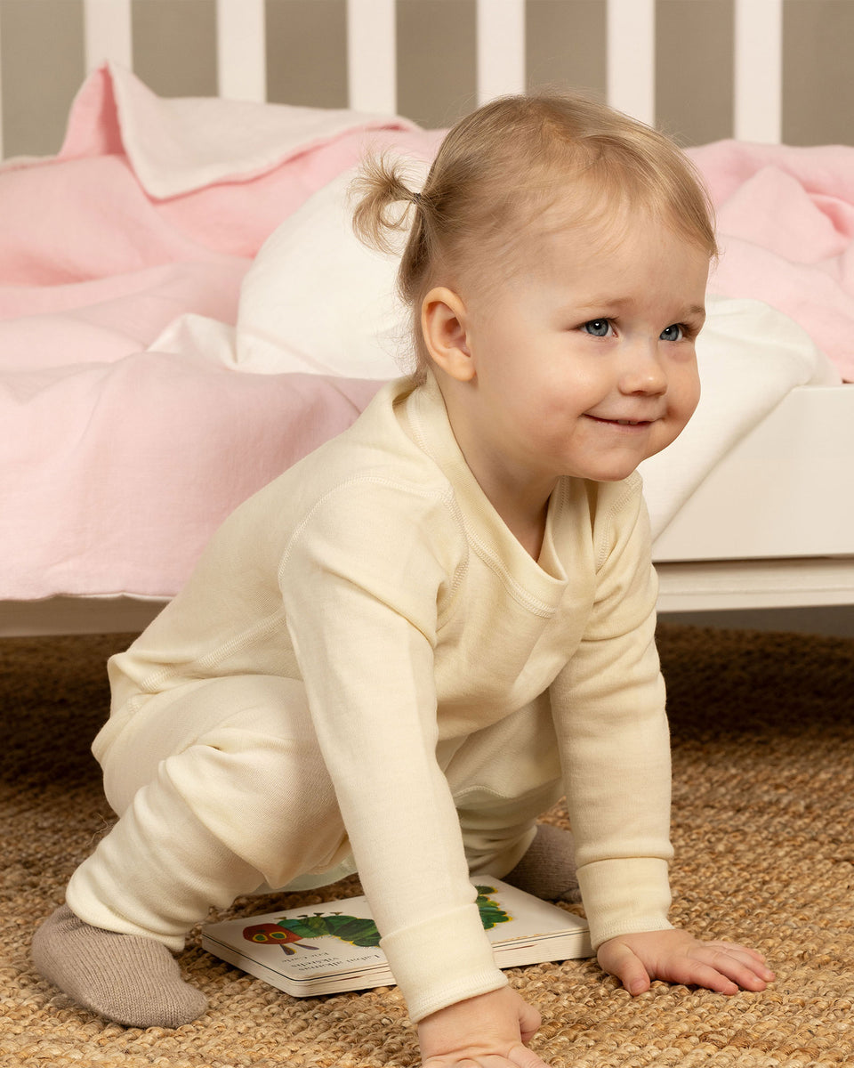 Vom Klettern auf Bäume bis zu faulen Sonntagskuscheln – dieses unglaublich weiche, langärmelige Zweiteiler-Set ist für jeden Moment deines kleinen Lieblings gemacht. Hergestellt aus 100 % natürlicher Merinowolle bietet das Kinder-Set eine luxuriöse, bequeme Passform, die sich mühelos dehnt und dein Kind in unvergleichliche Weichheit hüllt. Reine Merinowolle leitet Feuchtigkeit beim Spielen auf natürliche Weise ab, sodass dein Kind trocken und komfortabel bleibt – egal bei welcher Aktivität. Das Merinomaterial ist von Natur aus antibakteriell und garantiert ganztägige Trockenheit sowie ultimativen Komfort. Atmungsaktiv und unglaublich vielseitig ist dieses Woll-Set ideal als kuschelige Basisschicht unter den Lieblingsoutfits der Kinder oder als ihr bevorzugter traumhafter Schlafanzug. Die ultra-bequemen Leggings und das langärmelige Shirt sind mit Blick auf Eltern entworfen und bieten eine praktische, gut aussehende Lösung für den ganzen Tag. Das ist nicht einfach nur ein Merino-Set Es ist ein cleveres Must-have für deinen Kleiderschrank!
