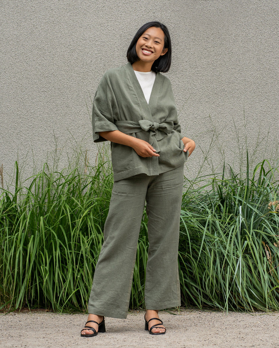 Erleben Sie wahrhaft einzigartige Eleganz mit unserem Leinen-Kimono-Wickeltop Sakura. Hergestellt aus atmungsaktivem, leichtem 100 % Leinen, sorgt diese Jacke im japanischen Stil dafür, dass Sie überall auffallen – egal, ob Sie eine neue Stadt erkunden oder eine Gartenparty genießen. Die Kimono-Strickjacke zeichnet sich durch weite, lockere Ärmel und eine anmutige Silhouette aus, die sich wunderschön an jede Körperform anschmiegt. Treten Sie stilvoll und bequem auf!