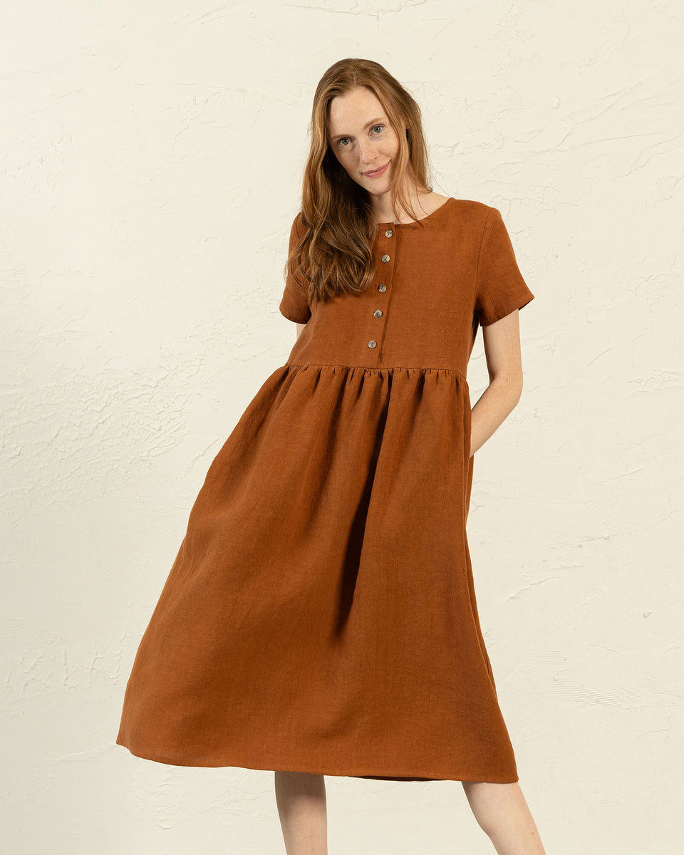 Wir stellen das Maria-Kleid vor, eine stilvolle und bequeme Option aus weichem, atmungsaktivem 100% Leinen. Seine Empire-Silhouette sorgt für eine schmeichelhafte Passform für verschiedene Körpertypen.