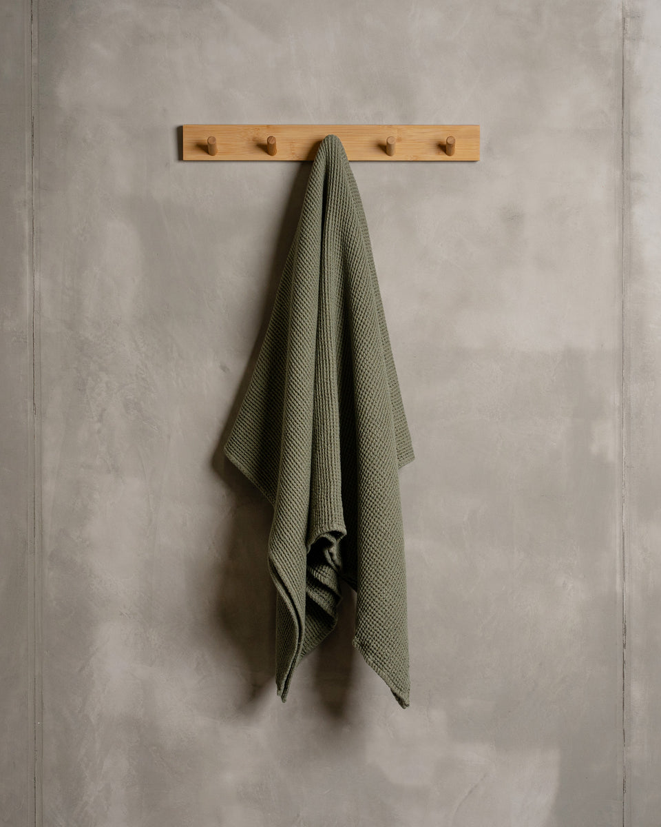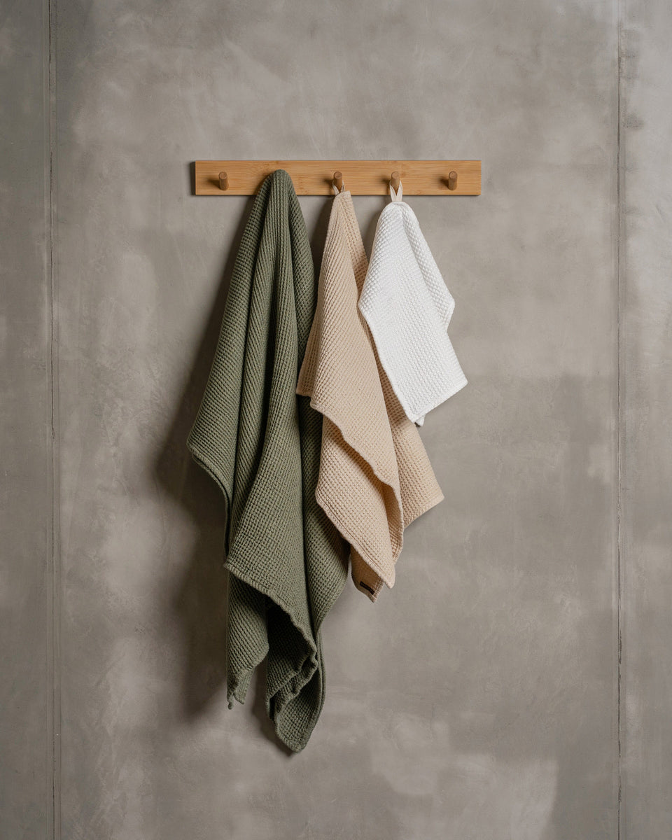 Waffel-Badetücher, erhältlich als Gesichtstuch, Handtuch und Badetuch, bringen praktische Vorteile in Ihre Badezimmer-Routine. Hergestellt aus Leinen mit natürlichen feuchtigkeitsableitenden Eigenschaften, zeichnen sich diese Tücher durch hohe Saugfähigkeit aus, die durch die Waffelstruktur verstärkt wird, welche die Oberfläche vergrößert und ein schnelleres Trocknen ermöglicht. Für langanhaltende Haltbarkeit konzipiert, behalten sie auch bei häufigem Gebrauch und Waschen ihre Form und Textur bei.